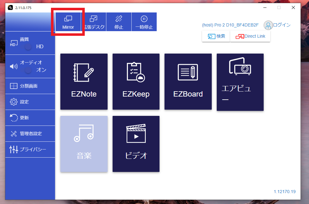 この状態で「Mirror」ボタンを選択することでパソコンの画面を投影することができます。