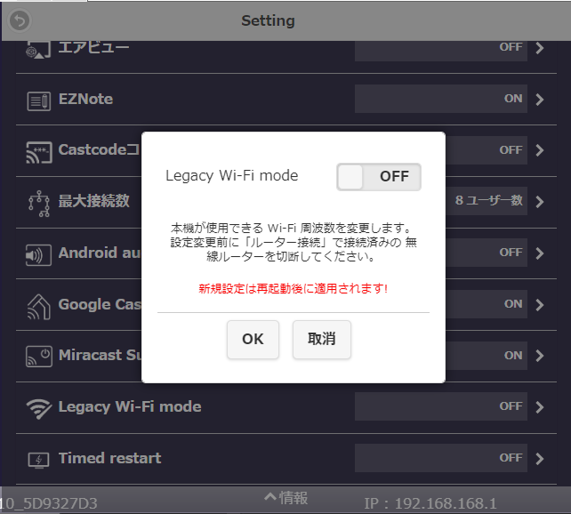 ※「レガシーモード」を利用するにはEZCastPro2のファームウェアバージョンが1.5608.9以上に更新されている必要があります。
