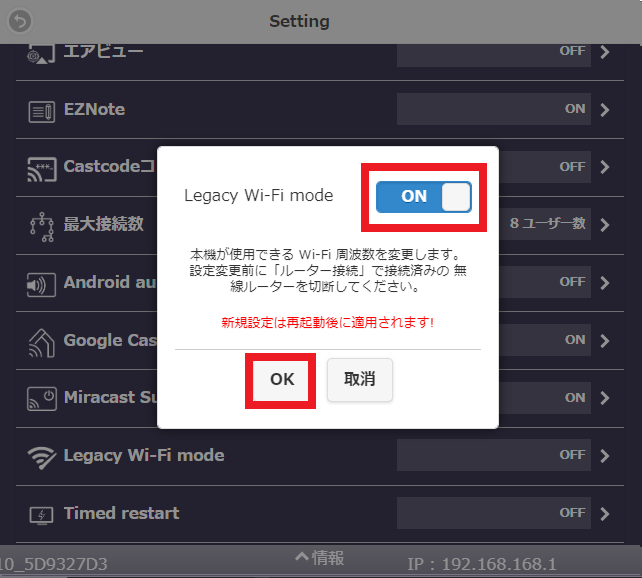 手順4.「Legacy Wi-Fi mode」を「ON(有効)」に設定して「OK(決定)」を選択します。