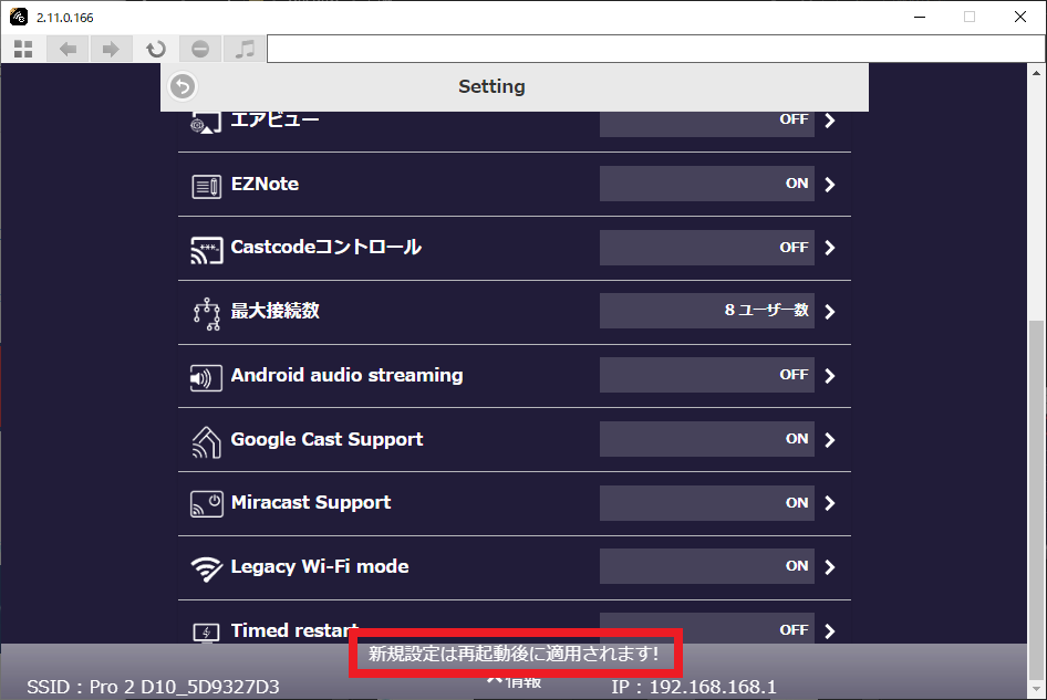 一部のファームウェアバージョンでは「新規設定は再起動後に適用されます」と表示され再起動が自動的に行われません。電源ケーブルの脱着などによりEZCastPro2本体を再起動してください。