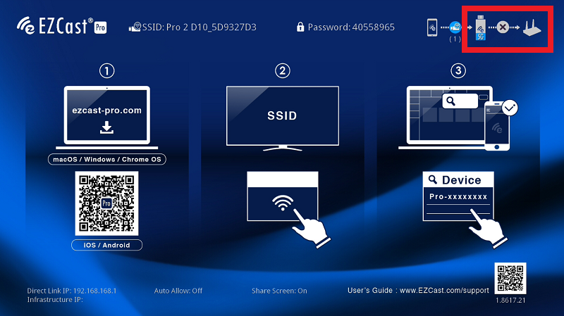 EZCastPro2が無線ルーターの5GHz帯Wi-Fiネットワークに接続されている間は、EZCastPro2は5GHz帯Wi-Fiを発信します。