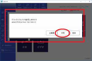 ホスト端末側にはゲスト端末のリクエストが表示されます。「共有」を選択することでテレビ画面で分割表示を開始することができます。「全画面」を選択した場合はリクエストを出したゲスト端末本体が投影する映像(写真)が全画面に表示されます。