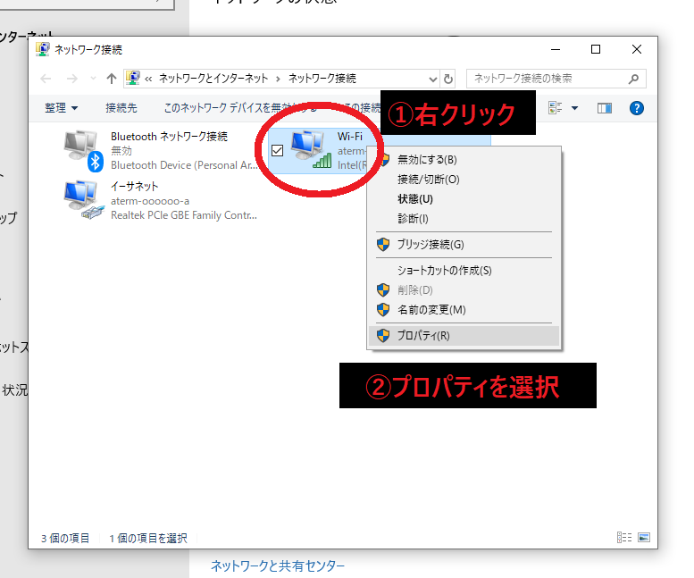 手順2.ネットワーク接続画面が表示されることを確認します。「Wi-Fi(ワイヤレスネットワーク)接続アイコン」を右クリックして「プロパティ」を選択します。