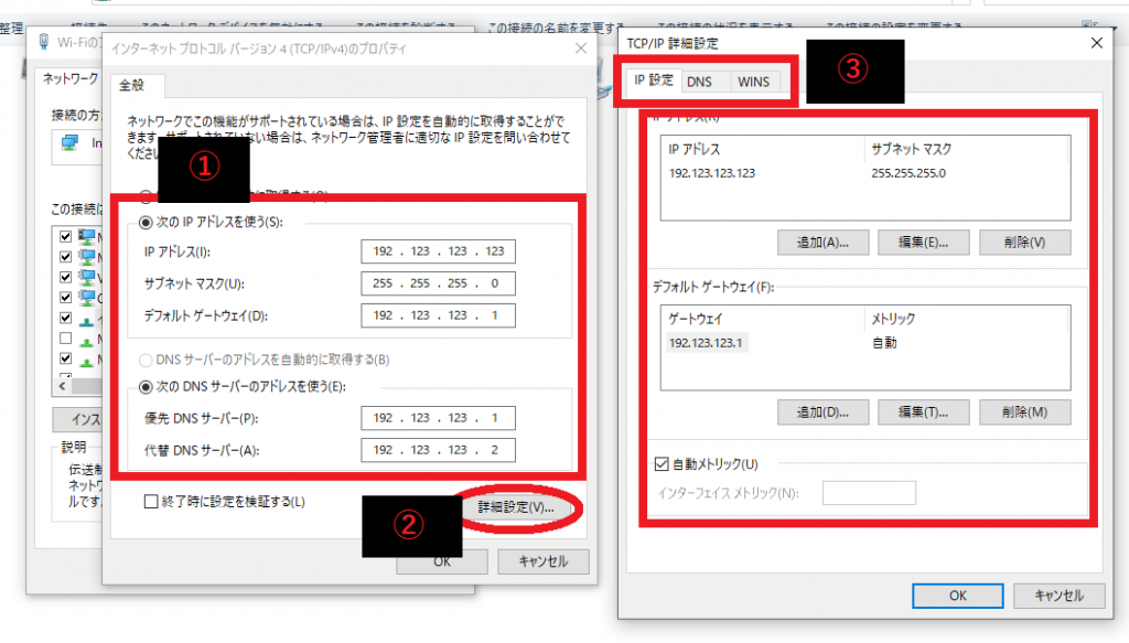 Windows10バージョン1709以降にはSSID別にTCP/IP設定を行う機能が追加されましたが、本ページでは取り扱いません。