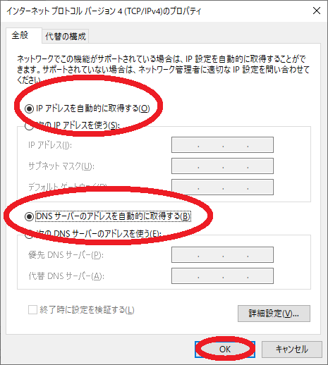 手順5.「IPアドレスを自動的に取得する」および「DNSサーバーのアドレスを自動的に取得する」を有効にして「OK」を選択します。