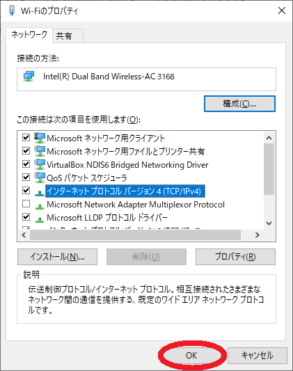 パソコンによっては類似の項目として「インターネットプロトコルバージョン6(TCP/IPv6)」も表示されるのでご注意ください。