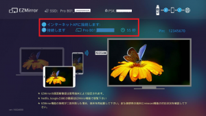「EZMirror」ボタンを選択した時点で、テレビの「EZCastPro待機画面」に表示される画像が変化しますが「ON」ボタンを押すまではカウントダウンは開始されずMiracastを開始することはできません。