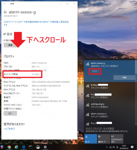 パソコンを無線ルーターにWi-Fi接続する場合は2.4GHz帯Wi-Fiアクセスポイントをご利用ください。パソコンを無線ルーターの5GHz帯Wi-Fiアクセスポイントに接続するとMiracastが開始されなかったり、切断や映像投影品質の低下が発生したりする場合があります。パソコンのWi-Fi接続先の「プロパティ」を選択して表示される「設定」画面を下へスクロールすることで表示される「ネットワーク帯域」で周波数を確認することができます。