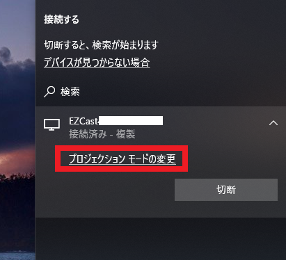 「設定」>「システム」>「ディスプレイ」>「ワイヤレスディスプレイに接続する」>「プロジェクションモードの変更」を選択します。