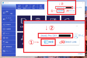①「検索 (SEARCHDEVICE)」ボタンを選択します。DEVICE画面で投影先を選択(ダブルクリック)してください。